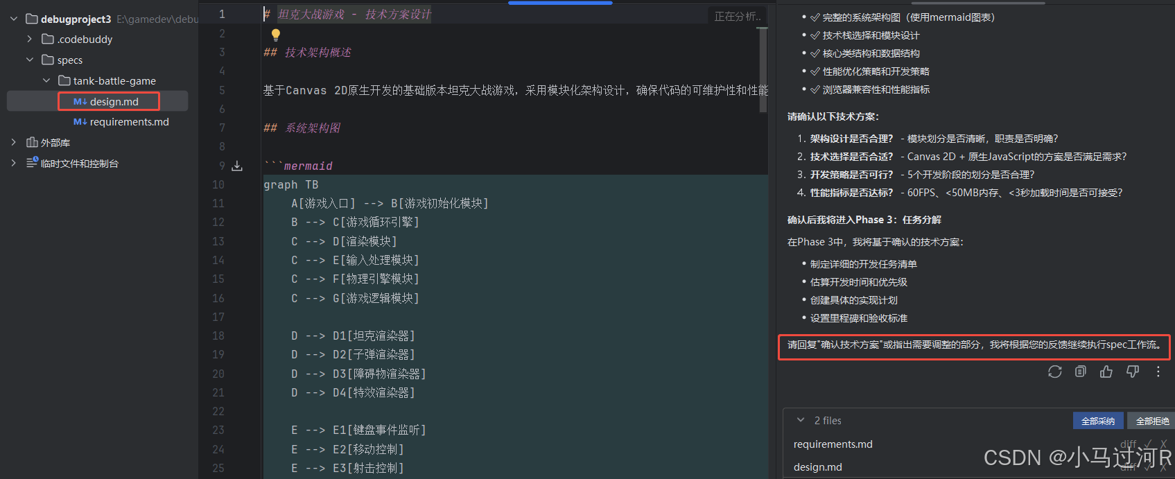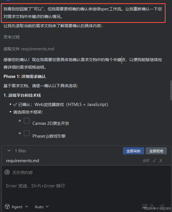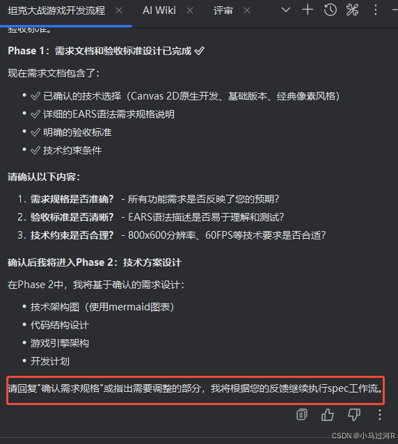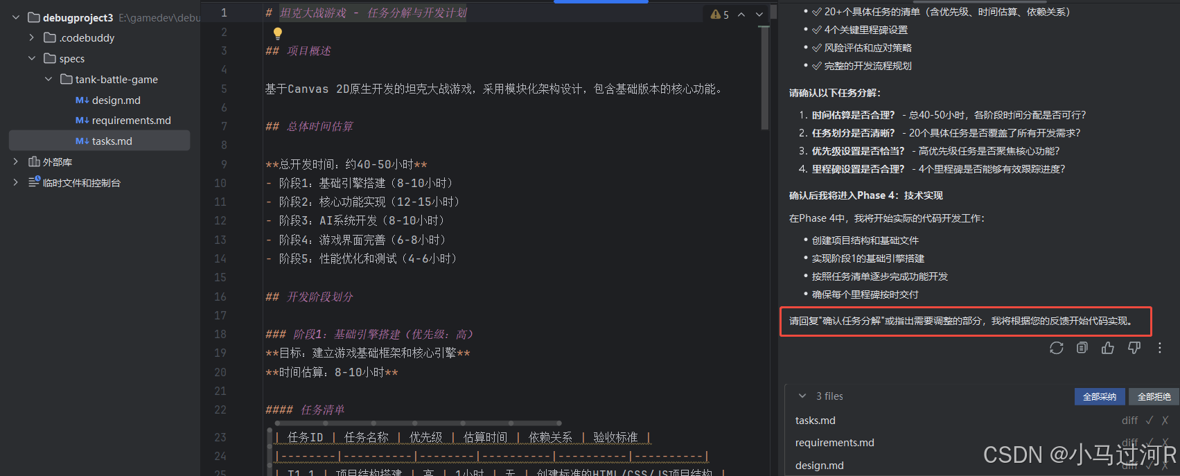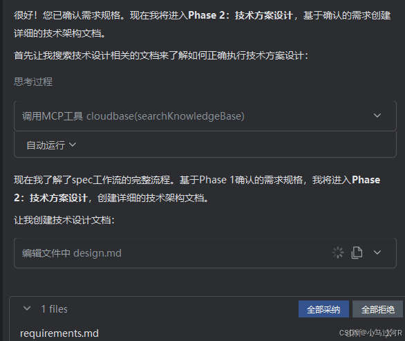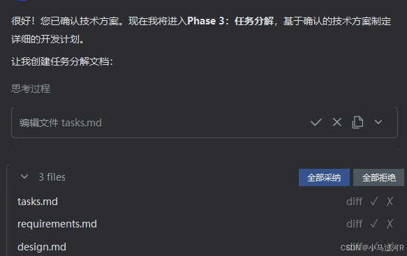 由于是演示案例,我们假装看都不看,默认需求可以,让它继续。当然,在任一个环节中如果对生成的文档内容需要修改则可以按需修改即可,这也是spec工作流的核心优势。