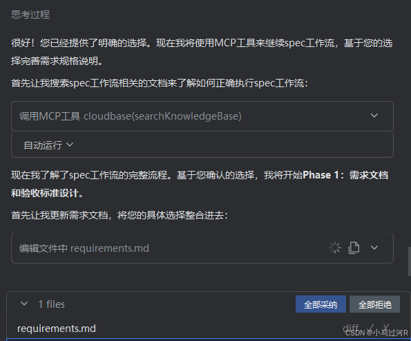 通俗理解起来可以这么理解,传统vibe coding就是输入需求等AI输出结果,而Spec工作流首先接收需求然后会输出类似requirements.md文档,该文档包含了AI对本次需求的理解和描述,此时人需要去评审AI所理解的需求并更正,OK后进行下一步;AI会继续输出类似design.md的设计思路文档,人评审修改确认后点击下一步;最后AI输出tasks.md文档,描述了具体任务实现的逻辑方式比如包含技术栈等,人评审修改确认后点击下一步开始执行生成代码。