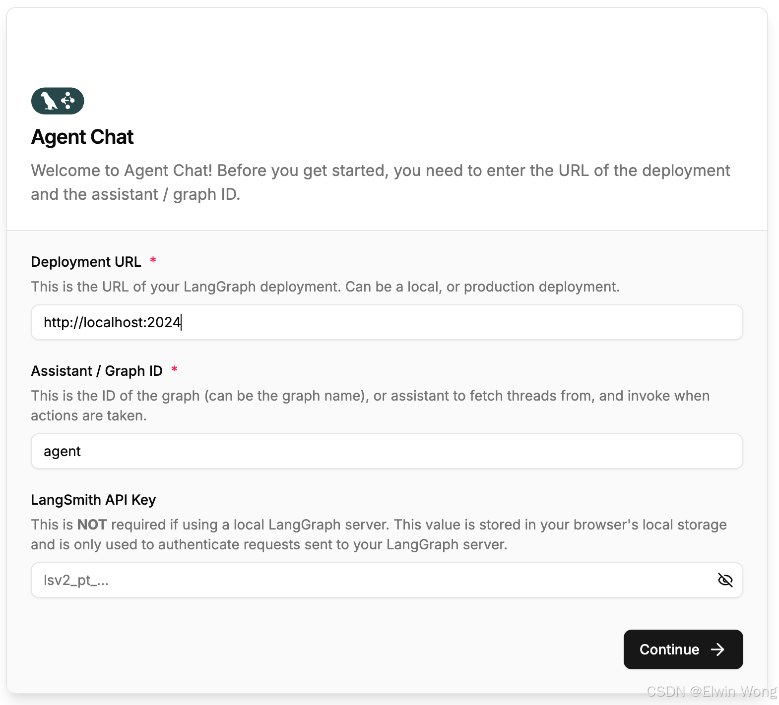 访问 Agent Chat UI,输入上面显示的API URL(这里是http://127.0.0.1:2024)以及Graph ID(在这里是agent)。然后,点击"Continue"后就可以开始与该agent 进行交互了,如下所示: