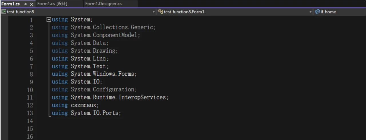 6.双击Form1.cs里面的Form1,出现代码编辑界面,在文件开头写入using cszmcaux,并声明控制器句柄g_handle。