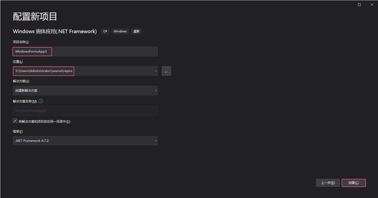 2.选择开发语言为"C#"和Windows窗体应用程序,点击下一步。