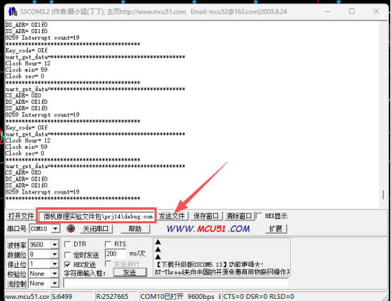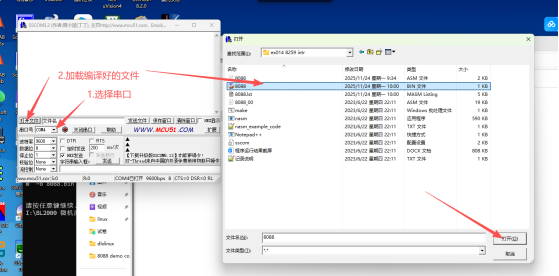 按8088单板机上的RESET复位键,串口助手显示3个ok,点击发送文件即可下载测试程序