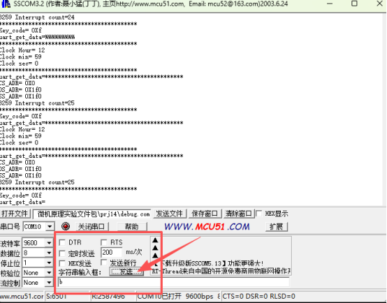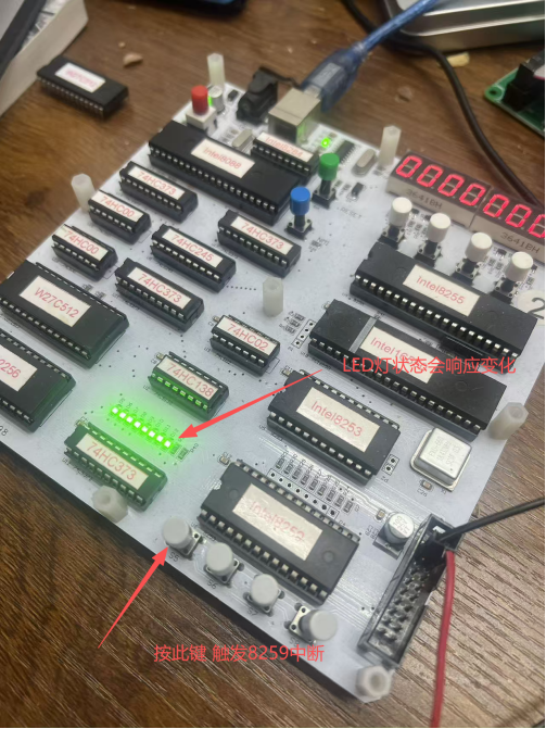 4.6 手动按单板机上S6按键,可以手动触发8259接收中断,数码管会动态切换数码管的显示。也可以串口发送字符,触发串口接收中断。