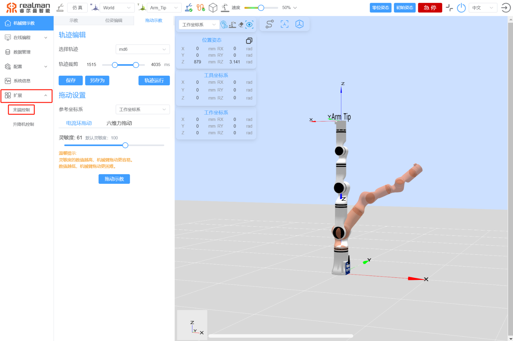 - 进入机械臂示教器,找到"扩展→末端控制"页面;(博主这边没有连接机械臂不好截图)