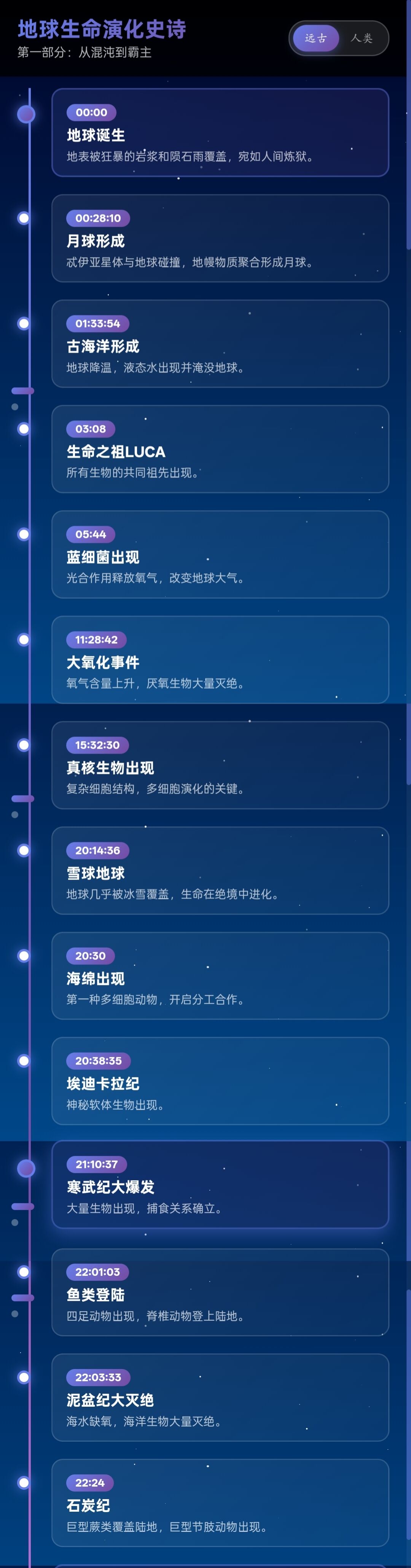 { time: "22:03:33", title: "泥盆纪大灭绝", desc: "海水缺氧,海洋生物大量灭绝。" },