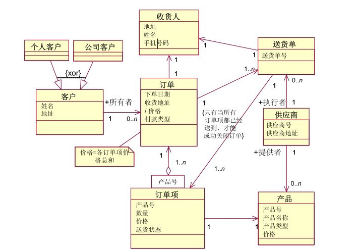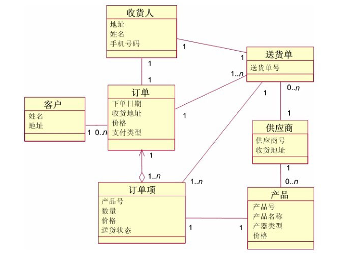 在前面我们已经详细讲解了类的组成及相应的图形表示法。借助于这一基础知识,就不难读懂在图中共有7个类:订单、订单项、客户、收货人、送货单、供应商、产品,并且在每一个类中都定义了若干属性。