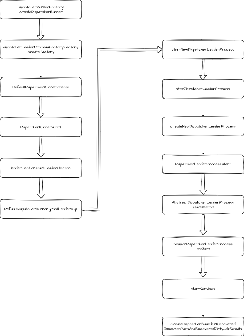 先创建工厂,创建完成后调用 DefaultDispatcherRunner.create 创建出 DispatcherRunner,接着是调用 start 启动选主流程。