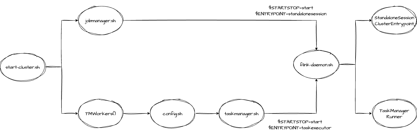 脚本会负责启动 JobManager 和 TaskManager,我们主要关注 standalone 启动模式,具体的流程见下图。