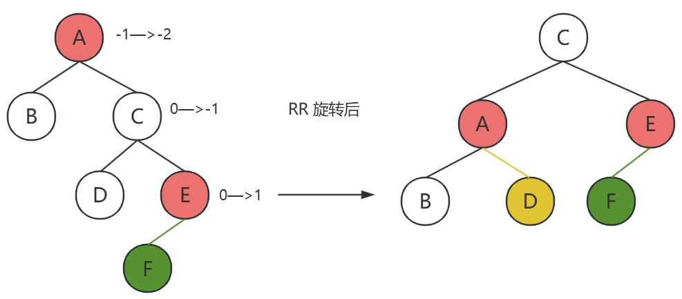E是插入新结点的父结点。E在A的右子树的右结点,所以叫RR插入,需要进行RR旋转(右单旋)