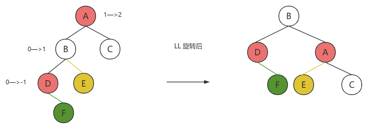 D是新结点插入的结点。D在A的左子树的左结点,所以叫LL插入,需要进行LL旋转(左单旋)