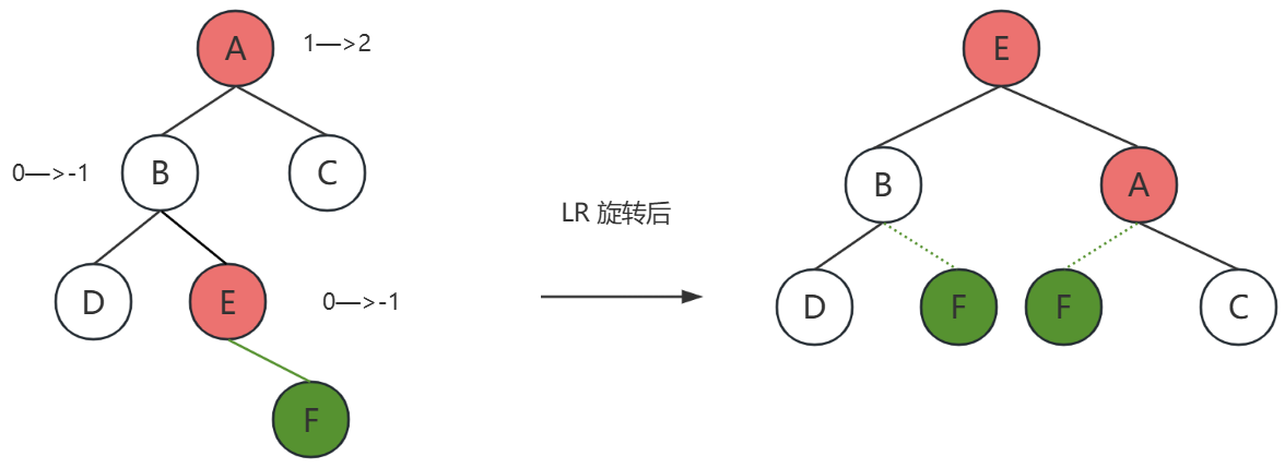 E是新结点插入的结点。E在A的左子树的右结点,所以叫LR插入,需要进行LR旋转