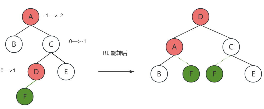 D是新结点插入的结点。D在A的右子树的左结点,所以叫RL插入,需要进行RL旋转