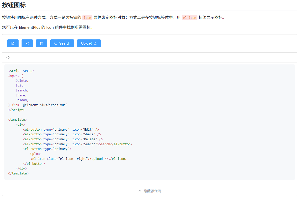 按钮使用图标有两种方式。方式一是为按钮的 `icon` 属性绑定图标对象;方式二是在按钮标签体中,用 `el-icon` 标签显示图标。