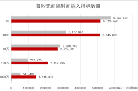 在对数据写入能力的测试中,随着模拟设备规模的提升,两款数据库的性能差异显著扩大。测试覆盖了从100台到1000万台设备的数据写入场景:当设备量达到4000台(每台附带10项指标)时,金仓每秒可插入的数据指标数已达到InfluxDB的1.62倍;而在千万级设备的极限压力测试中,金仓表现更为突出,写入性能达到InfluxDB的2.67倍。这一结果表明,面对高并发、大规模设备数据的持续写入,金仓在架构设计上具备优秀的扩展性与稳定性。