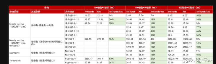 简单聚合查询(如单设备、单指标、短时间窗口聚合):两款数据库均能实现毫秒级响应,性能表现相近,属于同一水平。