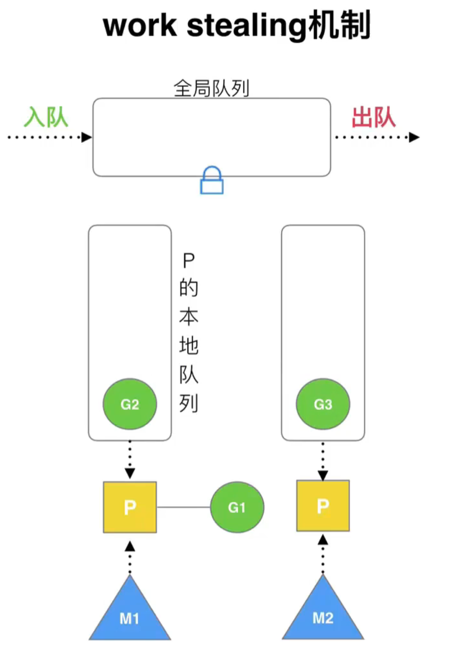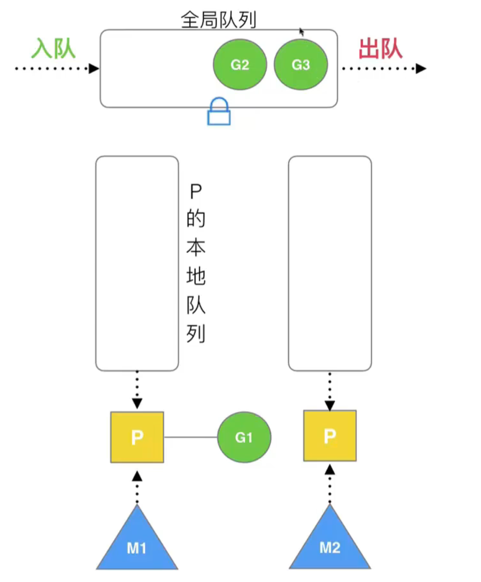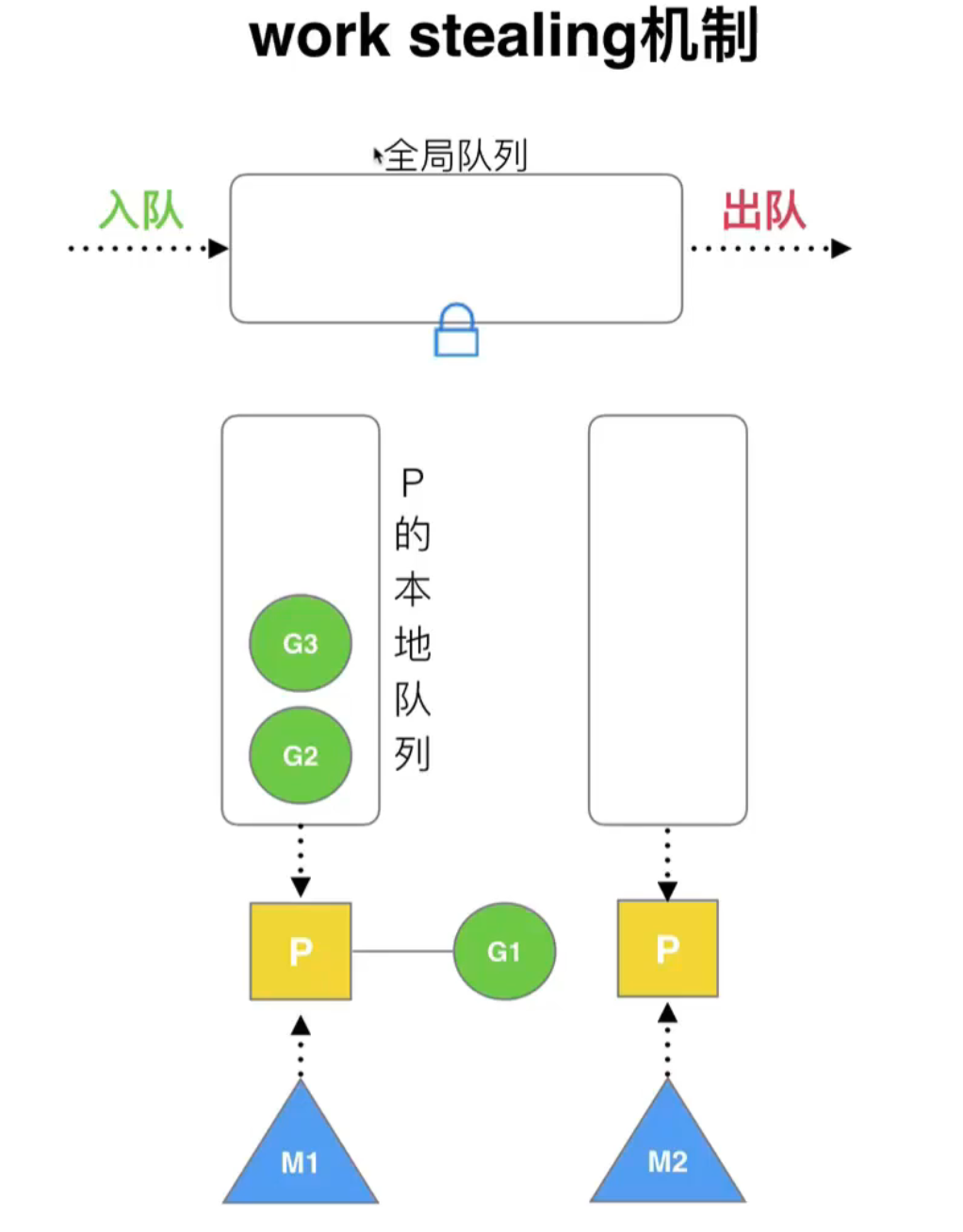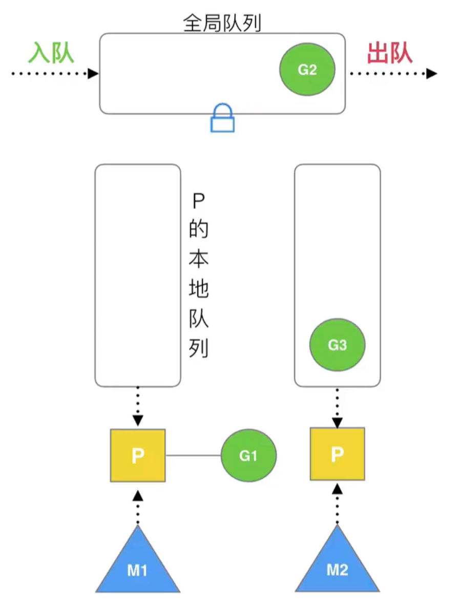 M2 此时没有任何队列,会优先从其他队列偷 G;但 M1 队列中也没有 G,就会从全局队列中获取 G: