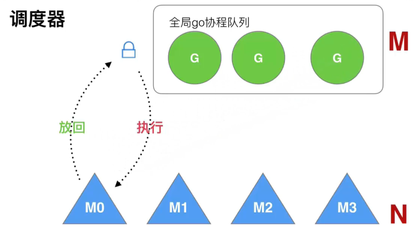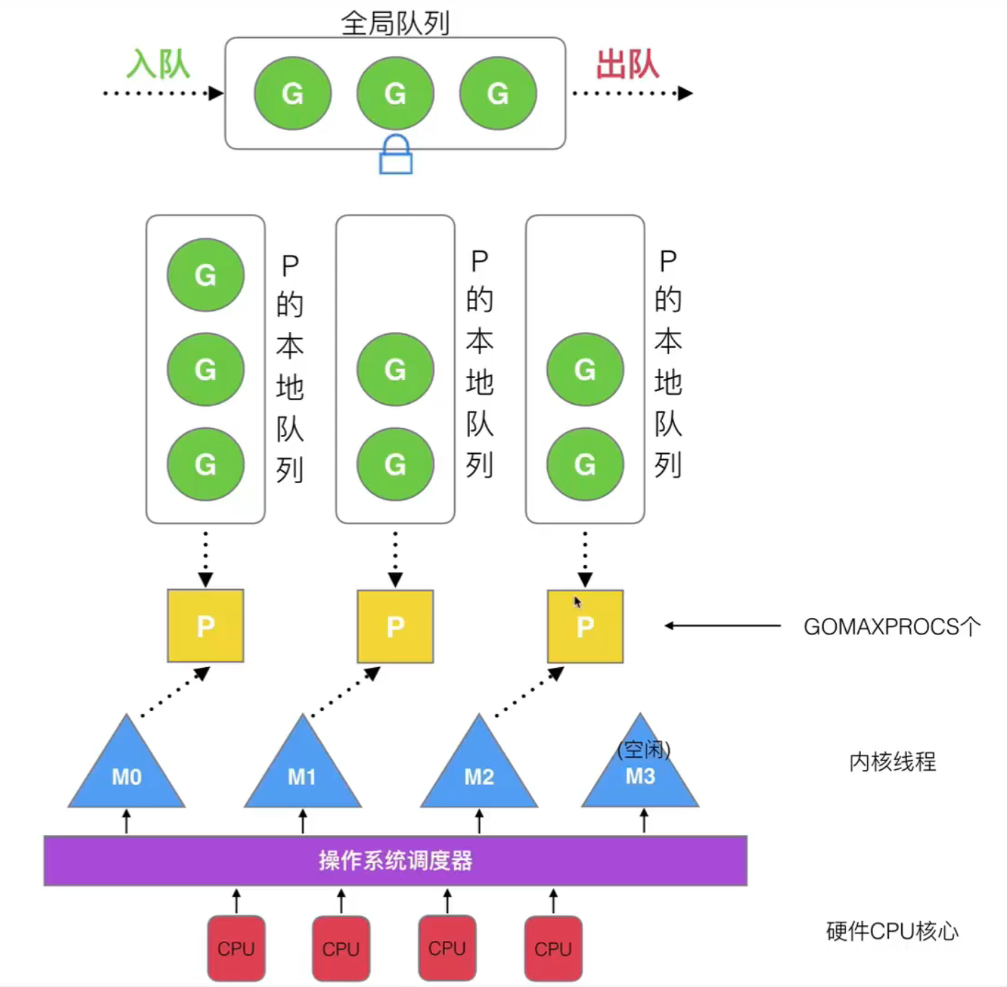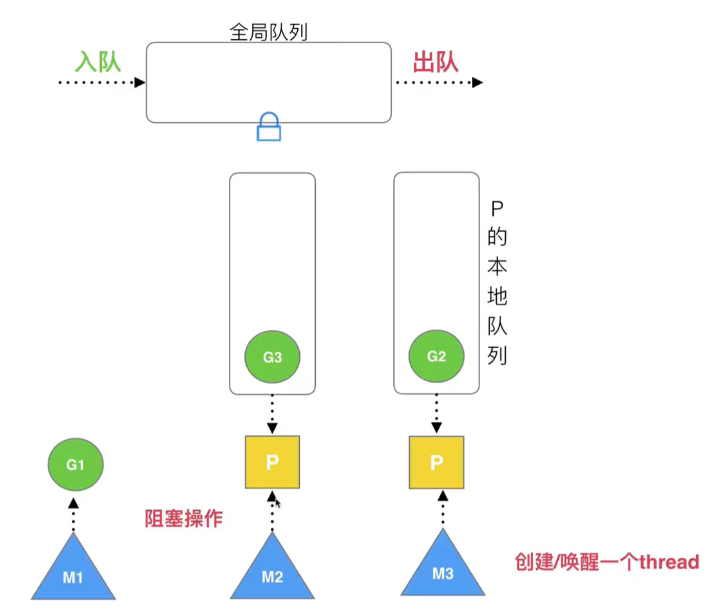 每个线程(M)通过一个process调度器(P)来处理协程(G),每个 P 管理一个存储 G 的本地队列,还会有一个额外的全局队列。