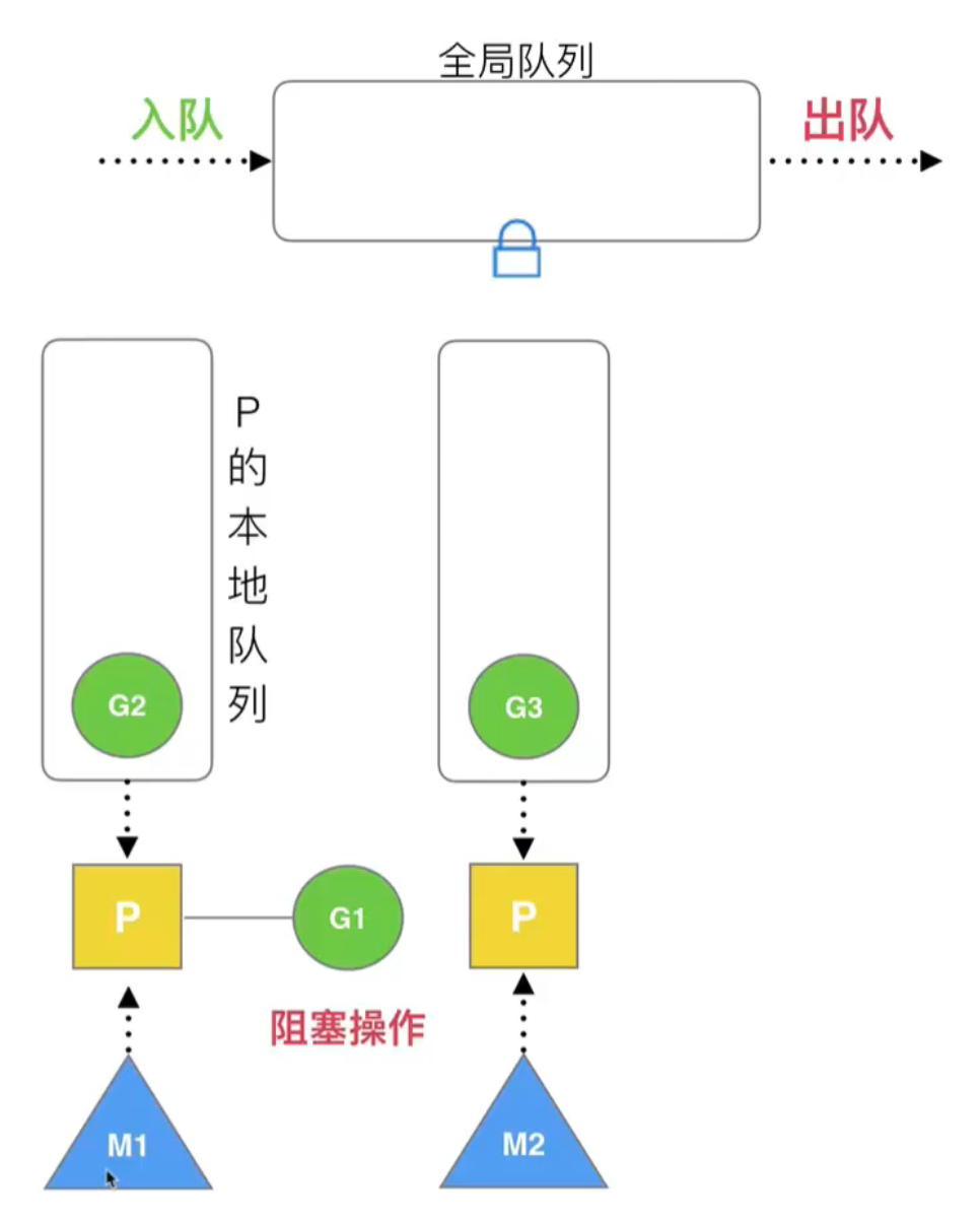 M1 线程的 G1 阻塞了,CPU 一直等待,没有任何意义;并且阻塞了队列中的 G2 执行。