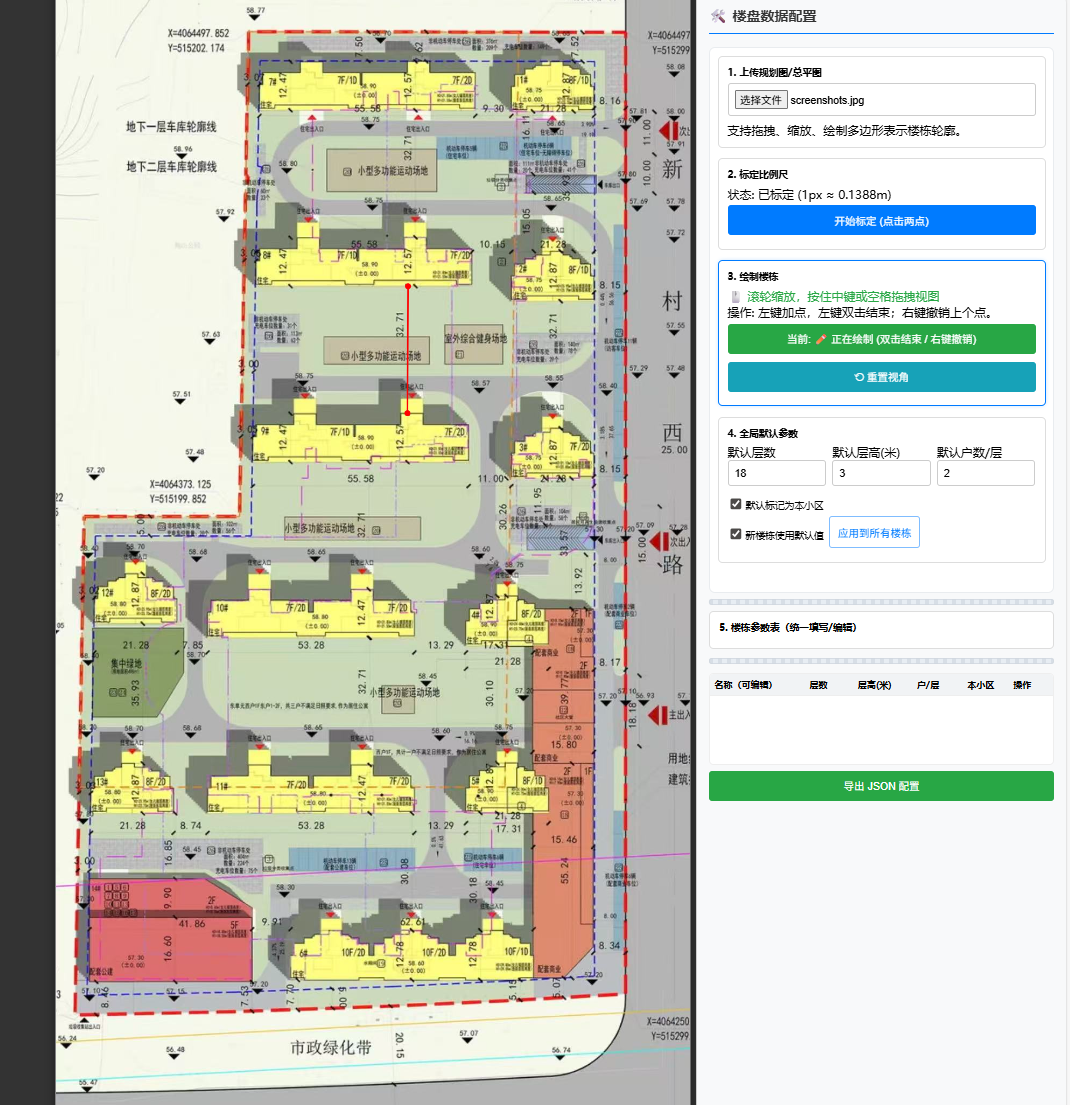 这是数据生产的入口。用户上传一张总平图,通过"两点标定法"确定比例尺(例如:图上两点代表实际50米),然后就可以在图上通过点击绘制楼栋的多边形轮廓。