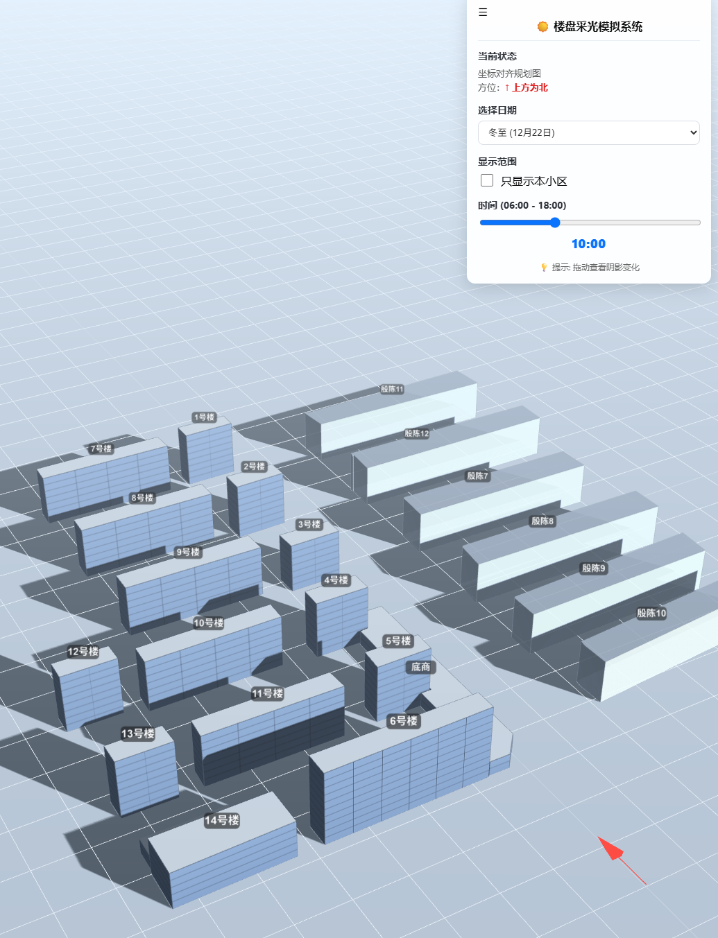 - 可视化 (Viewer):基于 Three.js,将配置好的数据生成 3D 模型,模拟冬至/夏至不同时间段的日照阴影。