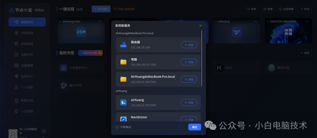1、发现服务:进入到节点小宝控制台,点击【发现服务】,可以自动扫描中心节点所在局域网内的常见服务,点击添加需要的服务即可。