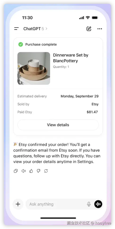 但技术的演进从未是简单的"取代",而是更高维度的"重塑"。AI agent确实会简化甚至取代部分前端开发工作,岗位数量可能随之减少,但前端并未走到"终点"------展示层成为前端最后的、也是最核心的阵营。当AI完成逻辑处理与接口调用后,如何将数据以更直观、更美观、更贴合场景的方式呈现给用户,仍需前端开发者的深耕细作:开发适配不同场景的展示卡片,在有限空间内优化信息层级;设计卡片内的精细化交互,实现滑动、点击、悬浮等多维度操作;确保不同设备、不同分辨率下的展示一致性,兼顾美观与性能。此时的前端,不再是"界面的搭建者",而是"体验的优化师",聚焦于人机交互的最后一公里。