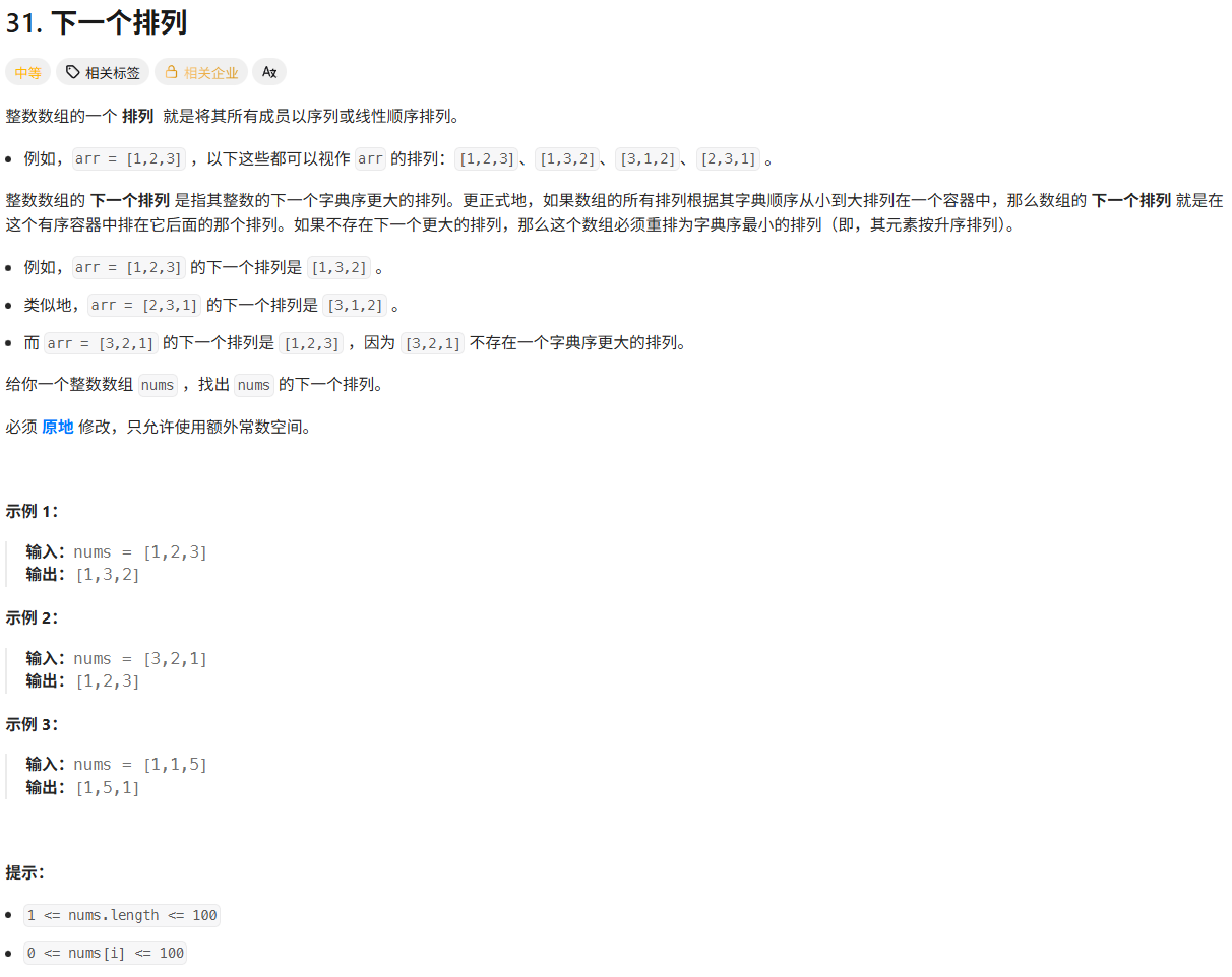 整数数组的下一个排列是指其整数的下一个字典序更大的排列。更正式地,如果数组的所有排列根据其字典顺序从小到大排列在一个容器中,那么数组的下一个排列就是在这个有序容器中排在它后面的那个排列。如果不存在下一个更大的排列,那么这个数组必须重排为字典序最小的排列(即,其元素按升序排列)。
