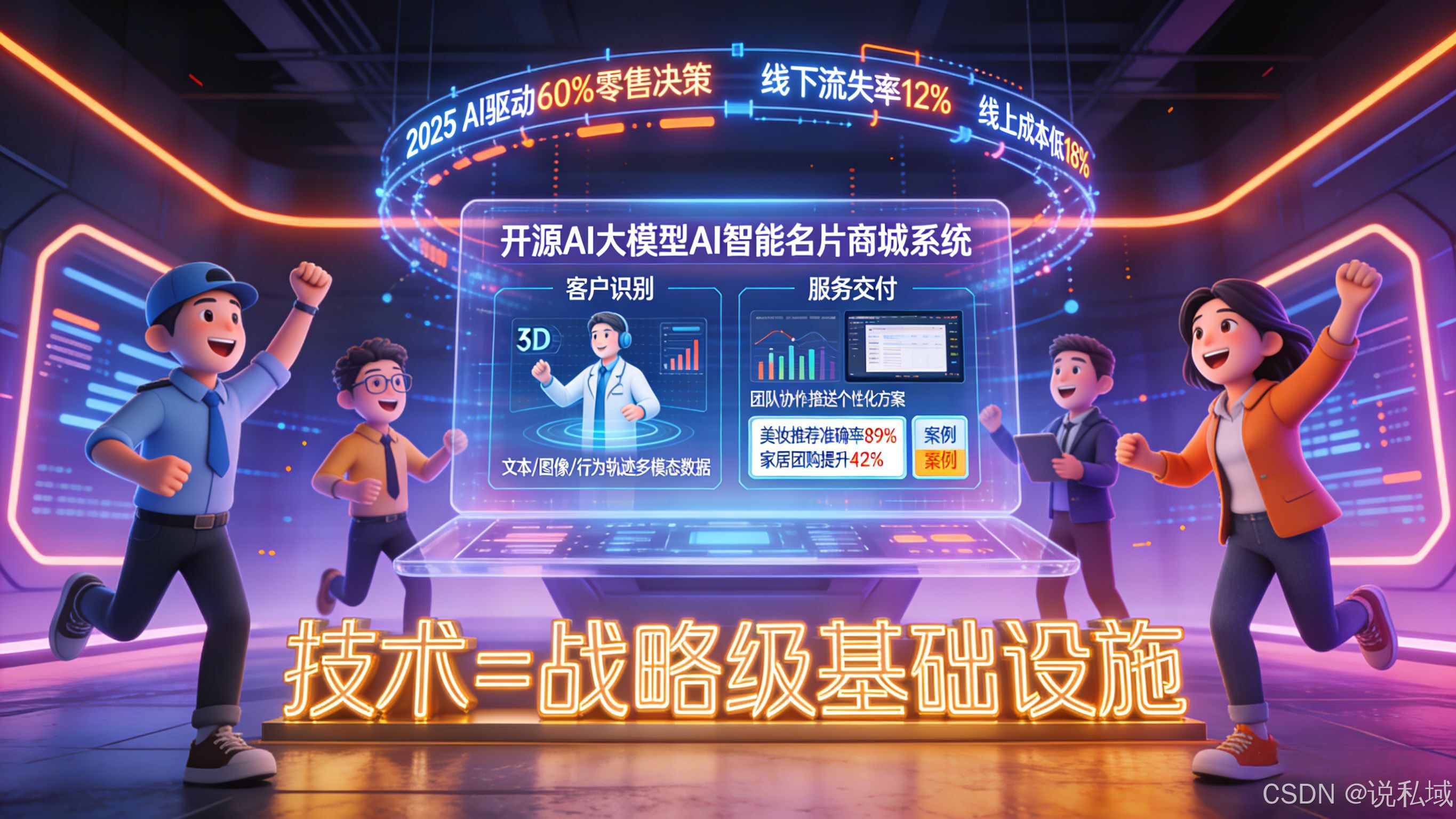 在数字经济时代,营销运营已从"经验驱动"转向"技术驱动"。全球零售业数字化转型报告显示,2025年AI技术将驱动60%的零售决策,而传统线下零售年均客户流失率达12%,运营成本较线上高18%。在此背景下,开源AI大模型AI智能名片商城系统通过整合开源AI大模型、AI智能名片与S2B2C商城技术,构建起覆盖客户识别、需求洞察、服务交付的全链路精准化体系,为营销运营提供技术基础设施。