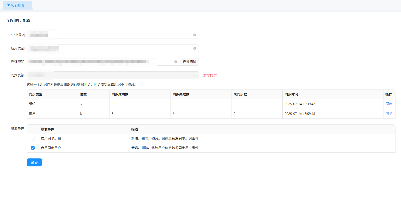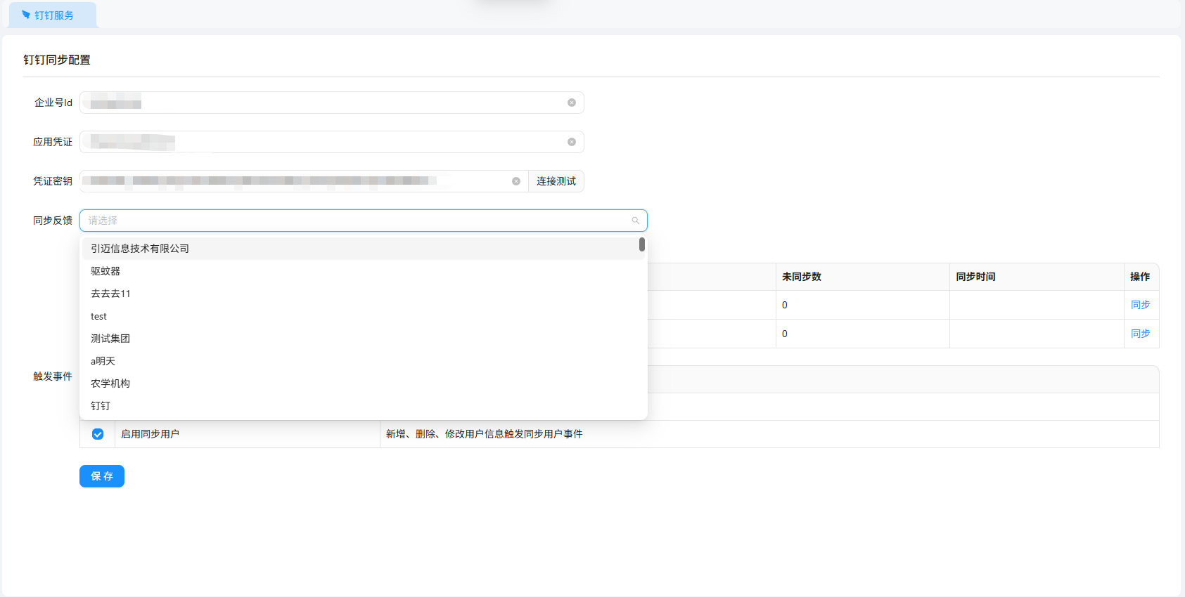 在同步设置支持选择第三方类型(企业微信、阿里钉钉)。设置页面配置触发事件和同步反馈等相关信息。