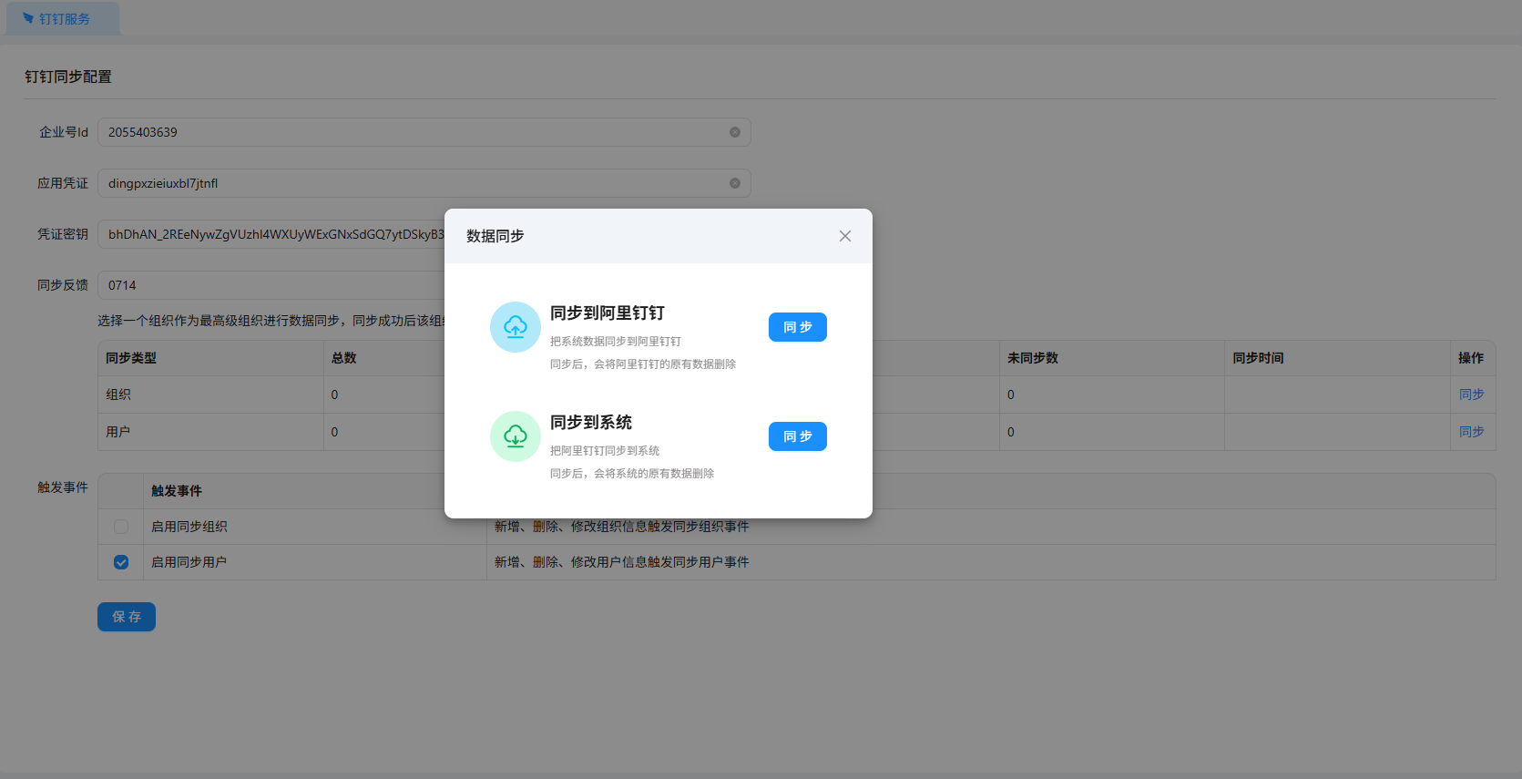 在同步设置-钉钉支持阿里钉钉与JNPF平台双向同步数据,点击同步按钮同步对应数据;在触发事件勾选触发事件后,对应的数据新增、删除、修改后会自动同步到钉钉,同步前,需绑定同步反馈