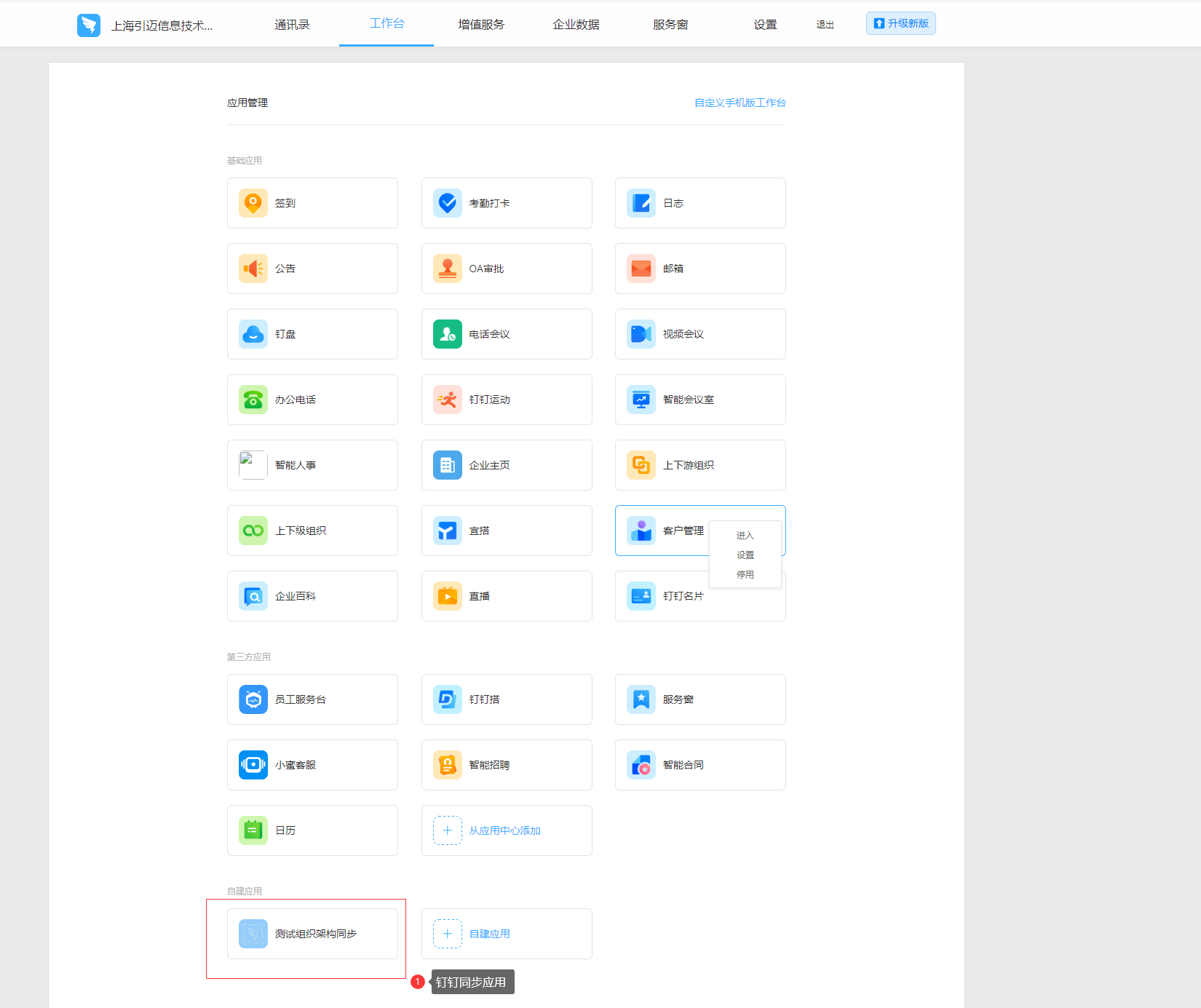 - 钉钉管理后台登录加载成功后,在自建应用,创建一个"测试组织架构同步"