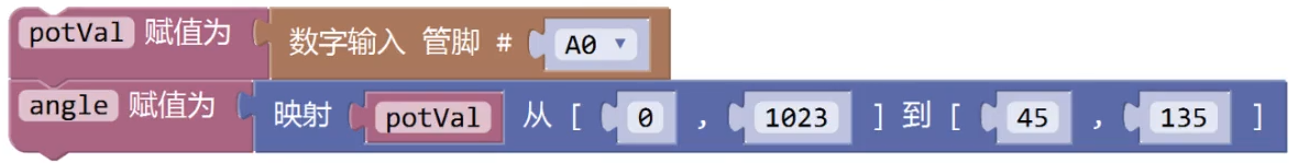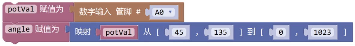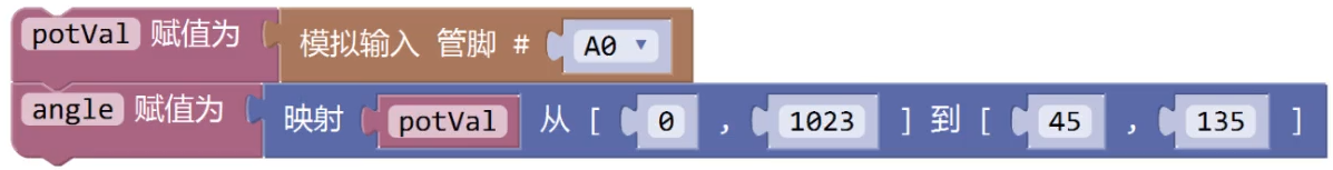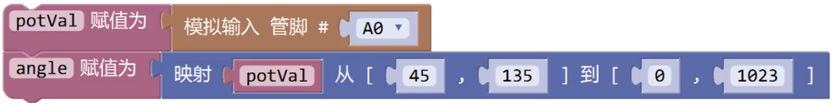 通过旋转电位器控制舵机的转动,下列选项中,可实现变量angle值的范围在45~135之间的程序是?