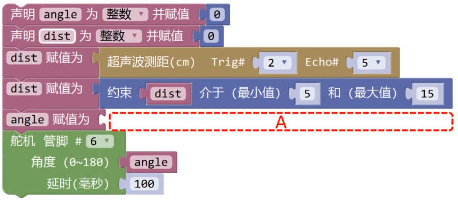 Arduino UNO/Nano主控板,通过超声波传感器检测障碍物的距离来控制舵机旋转角度的变化,舵机连接到主控板的6引脚,当障碍物靠近时,舵机的转动角度增大,部分程序如下图所示,其中红框A对应的程序是?