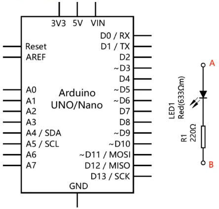Arduino UNO/Nano主控板,电路原理图和程序如下图所示,通过引脚5控制LED灯的状态,下列选项中,LED灯点亮所对应的电路连接是?