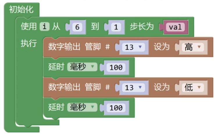 Arduino UNO/Nano主控板,下图程序模块控制板载LED灯闪烁3次,程序中变量val的值是?