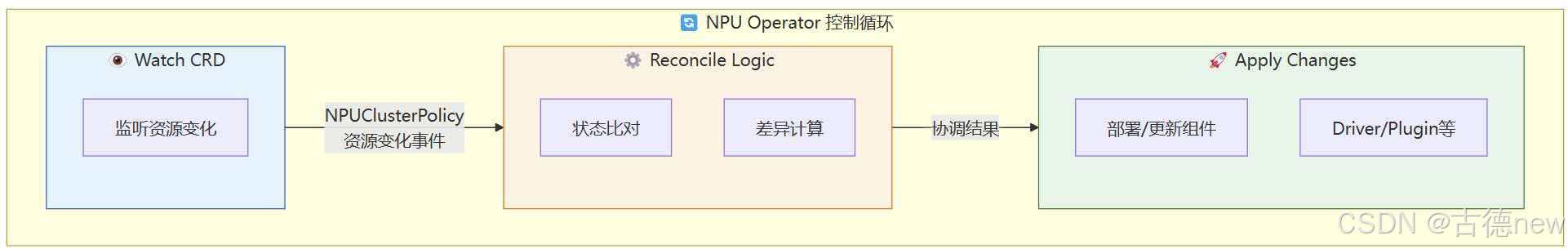 - CRD 监控:Operator通过监控NPUClusterPolicy CRD实例化的CR变化实现对管理组件状态的修改