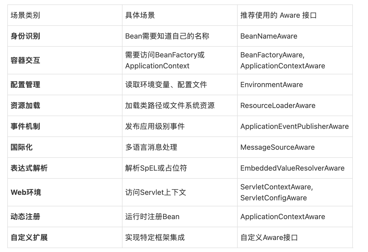 2.获取BeanFactory:通过实现BeanFactoryAware接口,Bean可以获取到BeanFactory,从而可以手动获取其他Bean,或者进行一些高级操作。