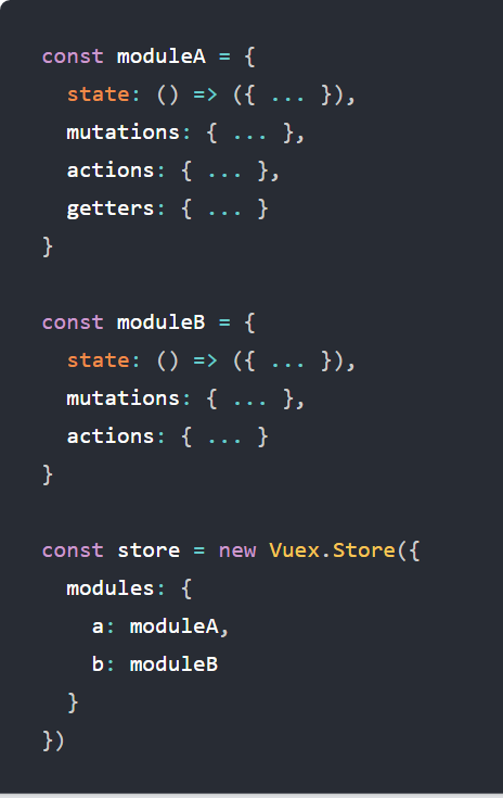 - modules:模块化状态管理,每个模块拥有自己的 state、mutation、action、getter