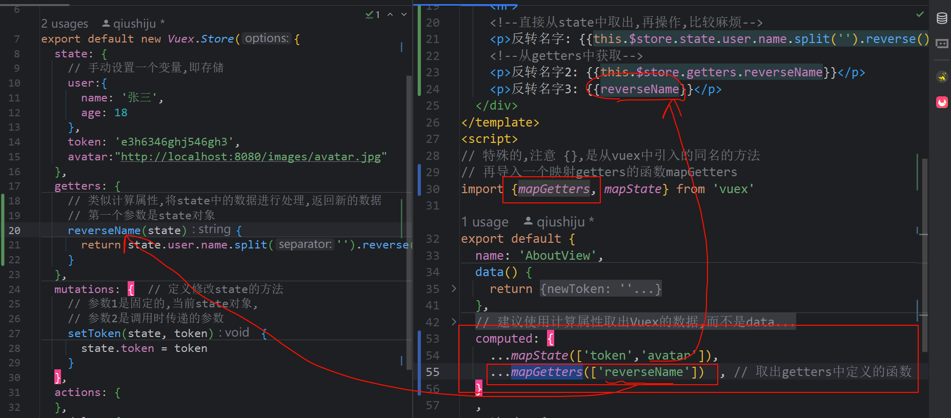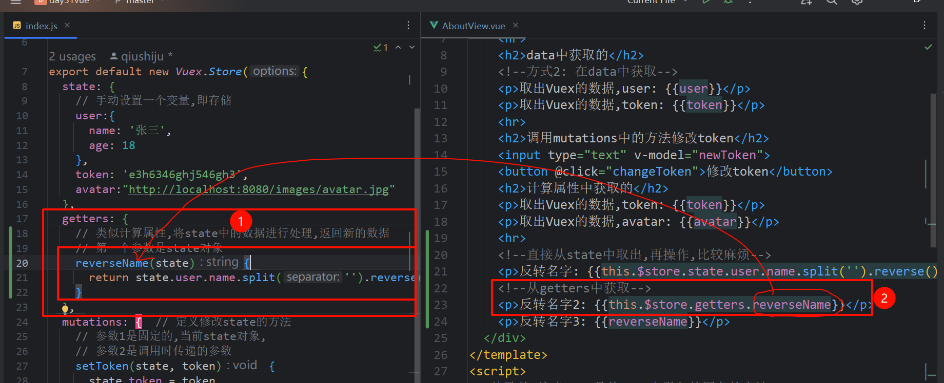 - getters:可以对 state 中的数据进行额外处理,类似计算属性的作用