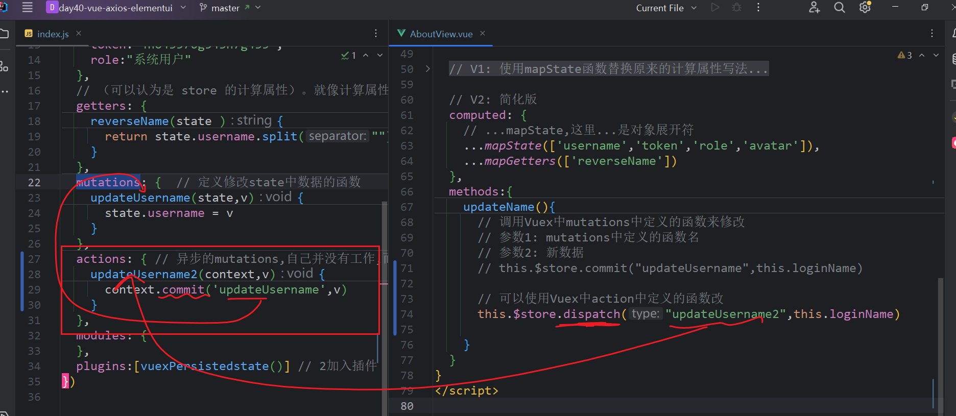 actions 中的方法中,通过 commit,调用 mutations 中方法,以保证 state 中数据的同步。