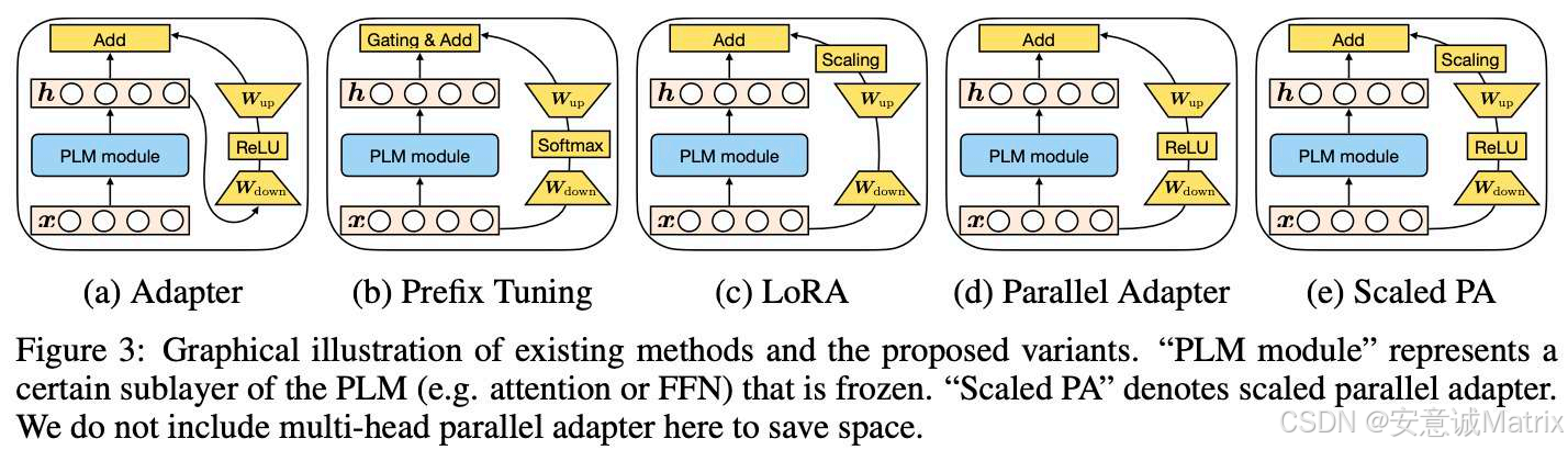 大模型(如GPT、BERT)的全量微调需更新数十亿甚至上万亿参数,带来了极高的计算、存储成本------这成为中小企业落地大模型的核心障碍。参数高效微调技术 由此成为主流:通过冻结预训练语言模型(PLM)的主参数,仅训练少量新增组件,即可实现下游任务适配。图中展示的5种方法是这类技术的典型代表:Adapter通过插入串行小型分支实现轻量适配;Prefix Tuning给注意力层添加可训练前缀引导任务;LoRA利用低秩分解压缩微调参数;Parallel Adapter将分支改为并行以提升效率;Scaled PA则在并行基础上增加缩放策略优化效果。这些方法在"低成本"与"高适配性"间寻找平衡,是当前大模型落地的关键支撑技术。