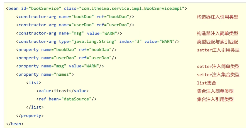 ①setter注入:简单类型(在bean中定义引用类型属性并提供可访问的set方法,配置中使用property标签value属性注入简单类型数据),引用类型(在bean中定义引用类型属性并提供可访问的set方法,配置中使用property标签ref属性注入引用类型对象) ②构造器注入:简单类型,引用类型。自己开发的模块推荐使用setter注入。