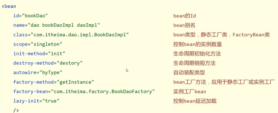 <bean id="" name="" class="" scope="" init-method="" destory-method=""> bean标签表示配置bean,id属性表示给bean起名字,name表示别名可以有多个,class属性表示给bean定义类型,scope有两个值singleton和prototype可以控制bean对象单例还是非单例,init-method和destory-method用来配置bean生命周期。