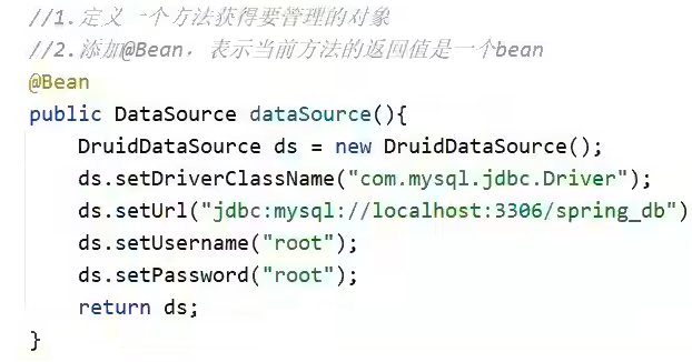 第三方bean,定义一个方法获得要管理的对象,添加@bean,表示当前方法的返回值是一个bean