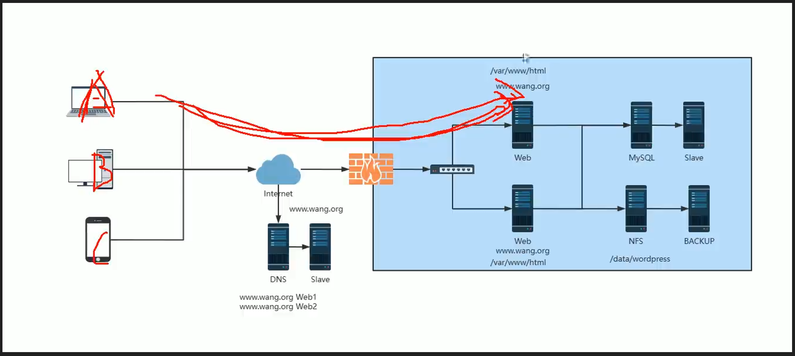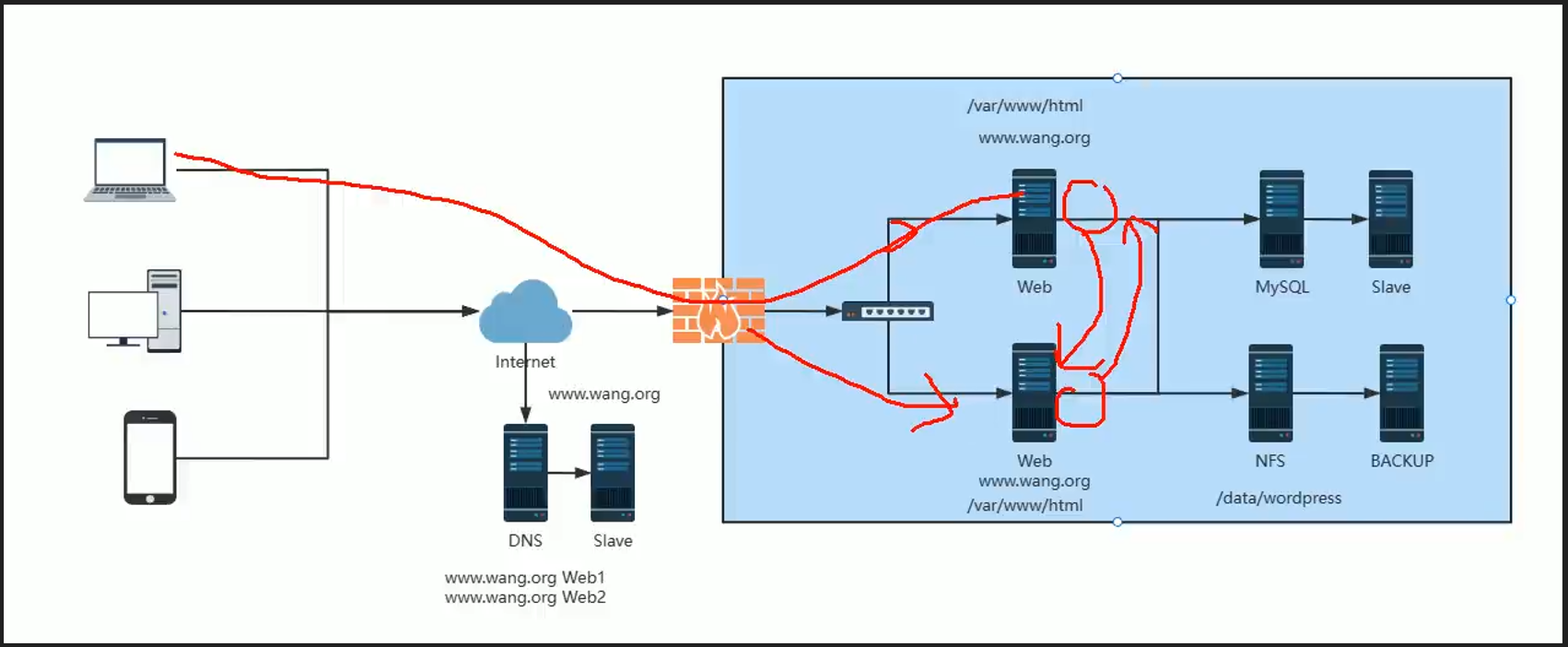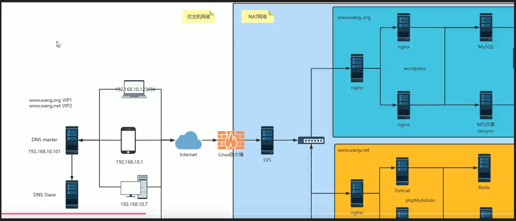 最终的架构图如上,用户访问一个LVS的地址,在LVS前面还会有Linux防火墙保证网络安全。LVS收到请求,将请求转到nginx,由nginx转发到对应的应用上面。即:先经过四层负载LVS,再经过七层负载nginx