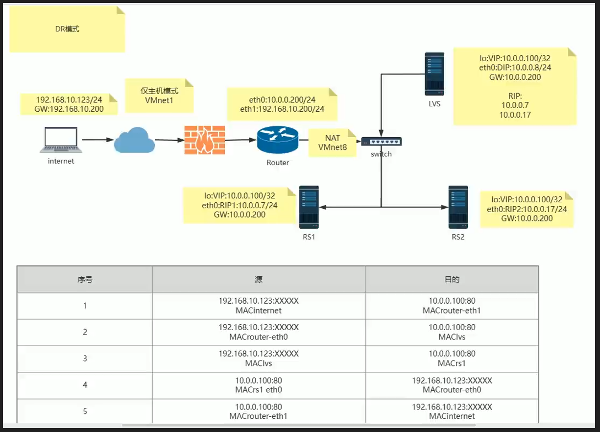 第一个数据包:源IP地址是客户端IP地址192.168.10.123,源端口随机,源MAC地址是客户端MAC地址。目标IP地址是LVS的IP地址10.0.0.100,目标端口为80,表示HTTP请求,目标MAC地址是路由器的MAC地址router-eth1,是因为数据包需要过路由器才能到LVS,MAC地址是下一跳地址。