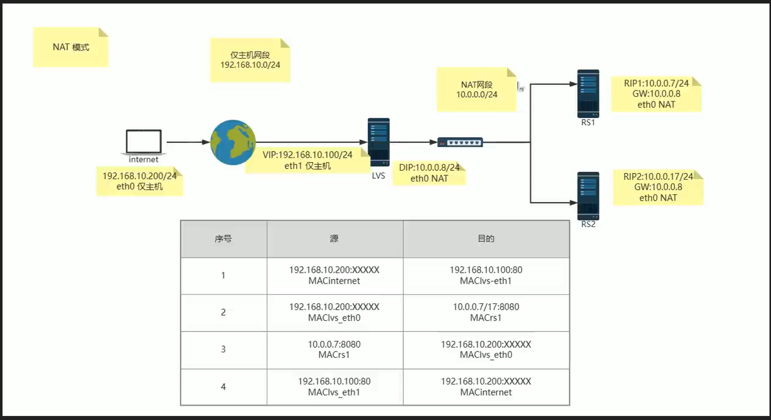 lvs-nat:本质是多目标IP的DNAT(目标网络地址转换),通过将请求报文中的目标地址和目标端口修改为某挑出的RS的RIP和PORT实现转发