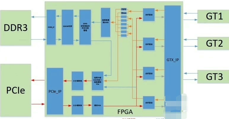 上位机通过PCle把数据发送给FPGA,FPGA打包后通过光纤模块发送出去,同时FPGA保存光纤过来的数据到DDR3中,当DDR3中的数据存够一定数量把DDR3中的数据通过PCle发送给上位机。