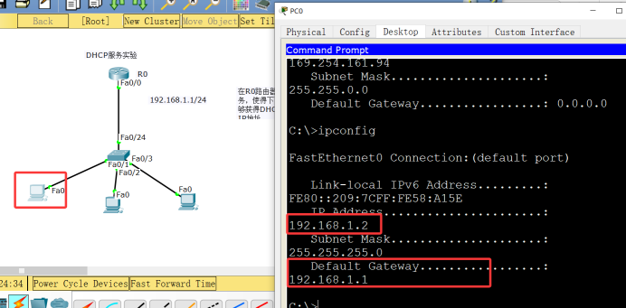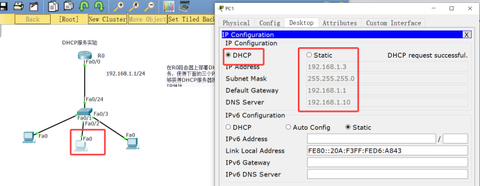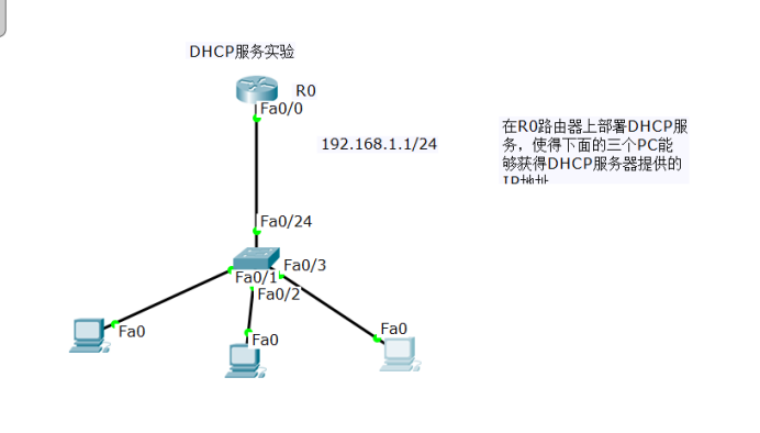 实验要求:在路由器R0配置DHCP服务,使得客户端的PC动态获得DHCP提供的IP地址。
