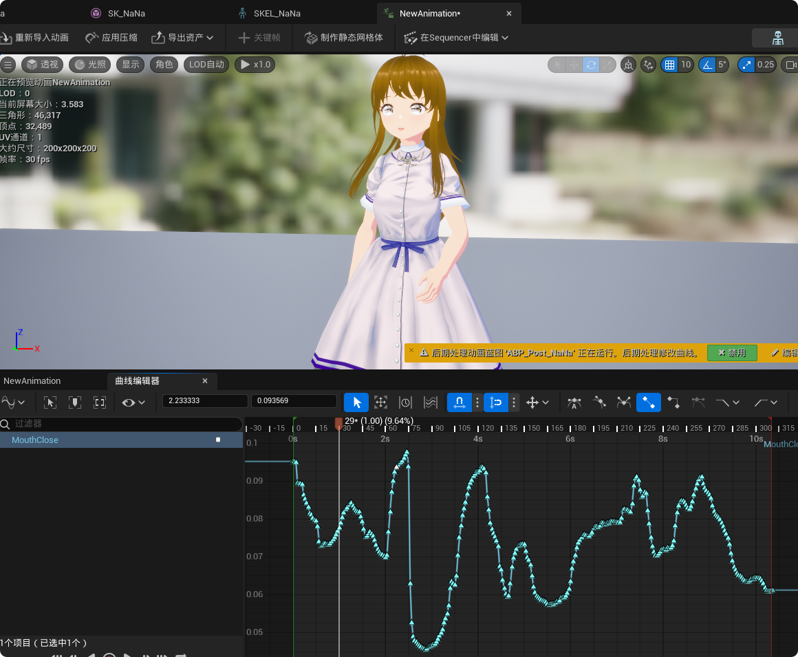 如果要调节表情细节,可以双击对应的曲线(这里双击"MouthClose")来打开曲线编辑器